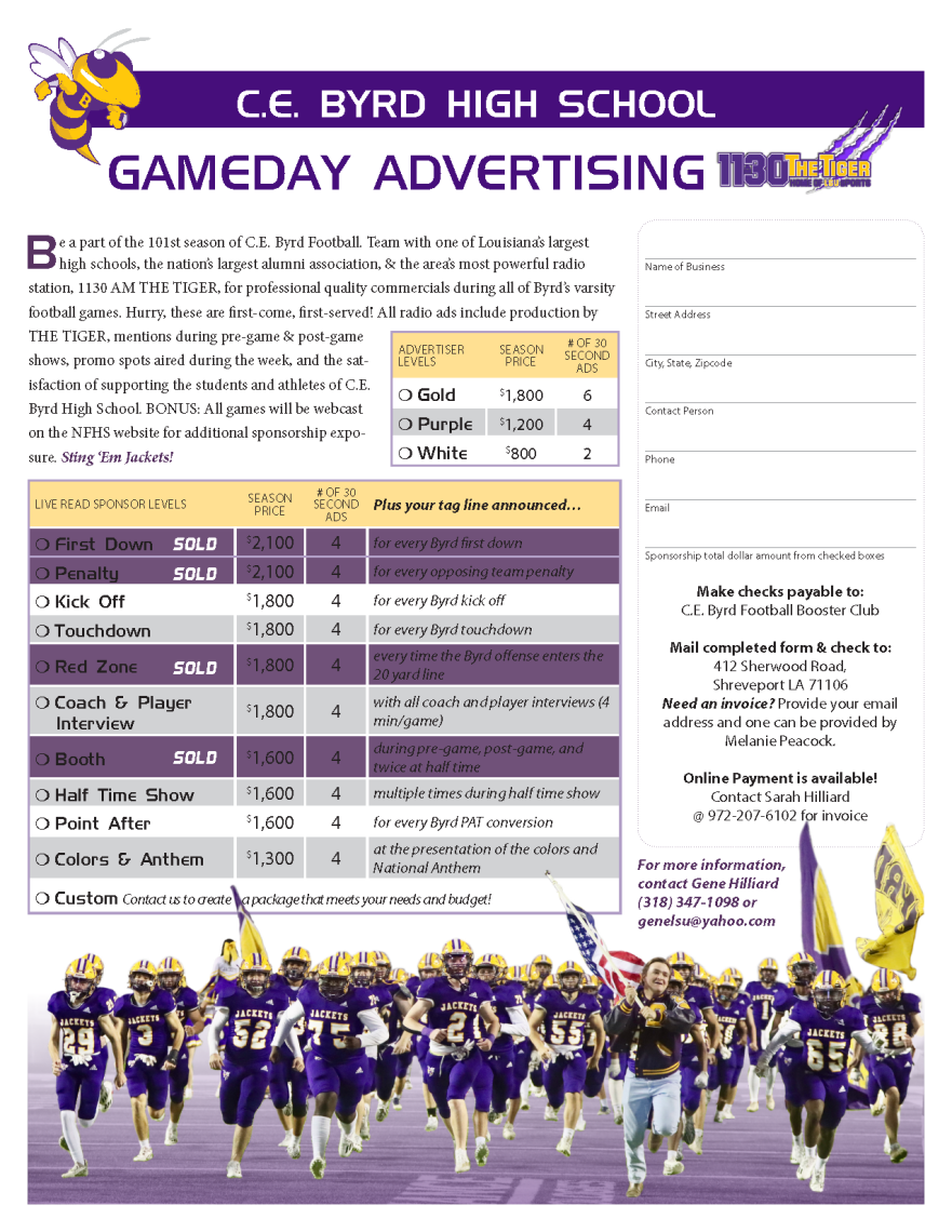 Be a part of the 101st season of C.E. Byrd Football. Team with one of Louisiana’s largest high schools, the nation’s largest alumni association, & the area’s most powerful radio station, 1130 AM THE TIGER, for professional quality commercials during all of Byrd’s varsity football games. Hurry, these are first-come, first-served! All radio ads include production by THE TIGER, mentions during pre-game & post-game shows, promo spots aired during the week, and the satisfaction of supporting the students and athletes of C.E. Byrd High School. BONUS: All games will be webcast on the NFHS website for additional sponsorship exposure.