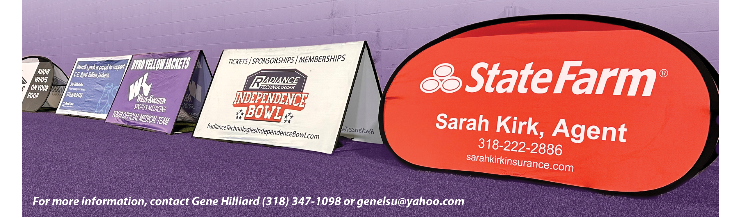 Get great visibility with professional quality on-field banners during all of Byrd’s home football games. These 6×3′ pop up signs are displayed on the track behind the Byrd bench for every home game. BONUS: We also promote our on-field sponsors at our Spring Game, Pre-season Scrimmage, 5K Fundraiser, and the Jamboree when we are the home team. All on-field sponsors are also listed in the game day programs. You’ll also get social media recognition during the season, along with the satisfaction of supporting the students and athletes of C.E. Byrd High School. Sting ‘Em Jackets!